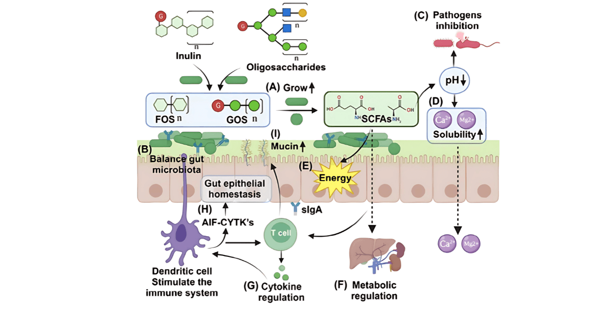 Prebiootikumid, nagu galakto-oligosahhariidid (GOS), frukto-oligosahhariidid (FOS) ja inuliin, pakuvad kehas erinevate mehhanismide kaudu toimides mitmeid tervisega seotud eeliseid. Need mehhanismid aitavad parandada soolestiku tervist, tugevdavad immuunsüsteemi, reguleerivad ainevahetust ja edendavad üldist heaolu.