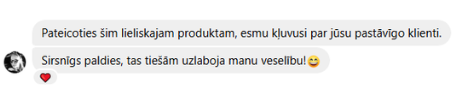 Lietoju jau gandrīz mēnesi, pārsvarā 1 paciņu dienā, retāk 2 paciņas. Pirmais novērojums , un kas manā gadījumā ir ļoti būtiski strādājot maiņu darbu – lieliski jūtos pēc darba, labāk atjaunojos. Ir vairāk enerģijas tieši pēc darba , kādreiz diena bija norakstāma. Par sātu pat nerunāsim- kopā ar zemenēm un auzu pienu ( viens no piemēriem ) sāts saglabājas lielu daļu dienas. Uzskaitīt varētu ļoti daudz – arī ķermenis ir palicis mirdzošāks, āda elastīga, spīdīga . Sejas āda, lai ar bija labā stāviklī- tagad parādījies vēl veselīgāks skats . Cilvēki jautā , kas ar tevi – labi izskaties 😀😍Dodu 100 balles no 10! Turpināšu noteikti lietot kā neatņemamu ikdienas sastāvdaļu!